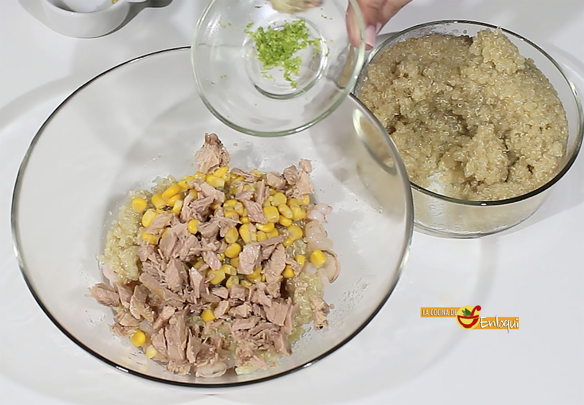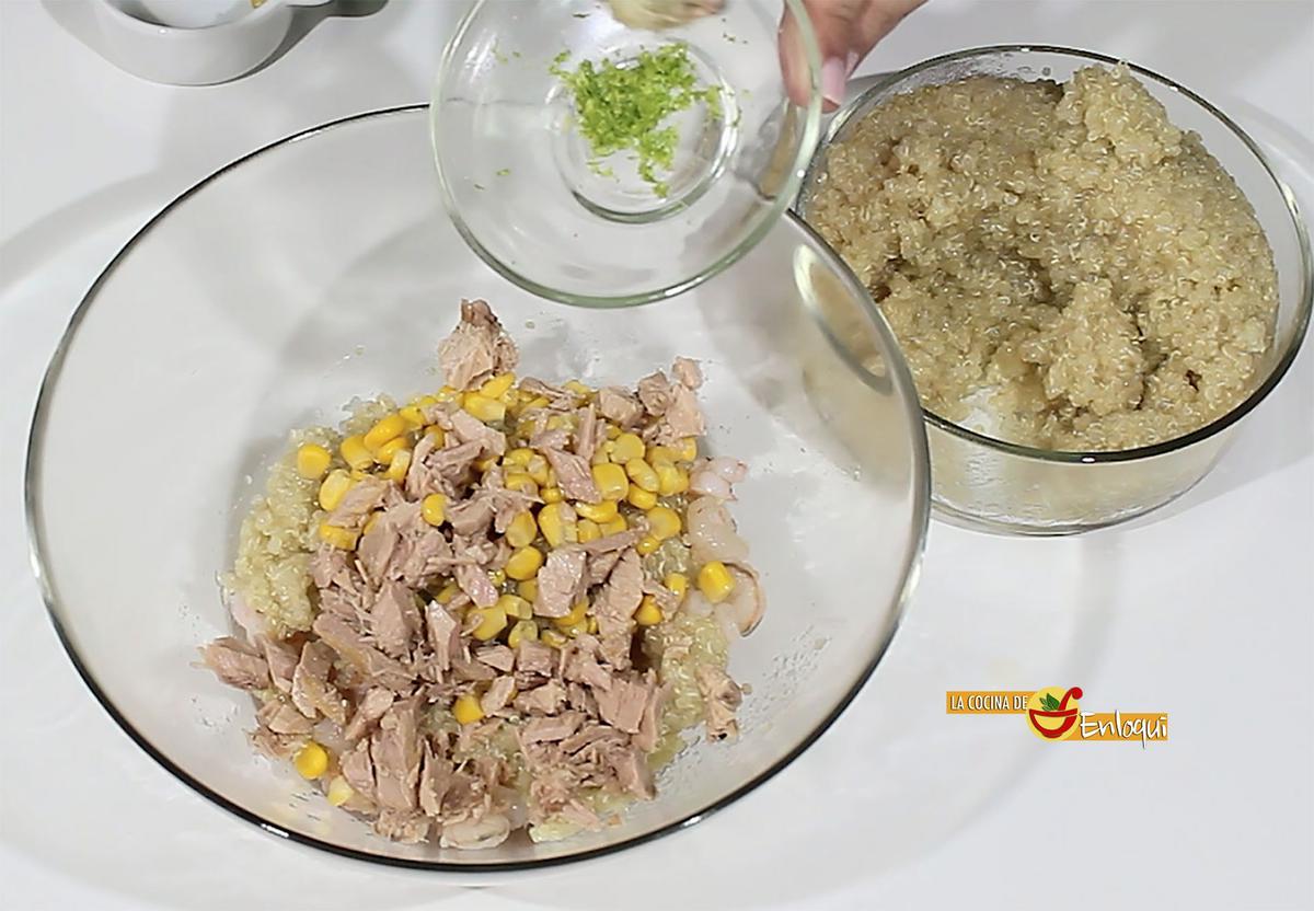 Suma a lo anterior el maíz, el atún desmigado y la ralladura de lima que aportará frescor, sabor y aroma.