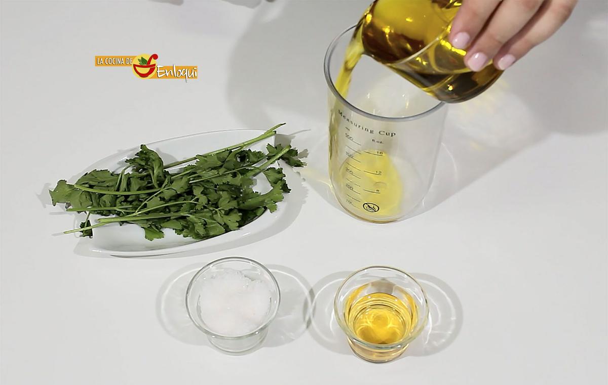 Para ello sólo tienes que poner en el vaso de la batidora un poco de aceite de oliva virgen extra (Aove), un chorrito de vinagre, sal y unas ramas de cilantro fresco. Tritura todo con la batidora hasta que quede una mezcla homogénea.