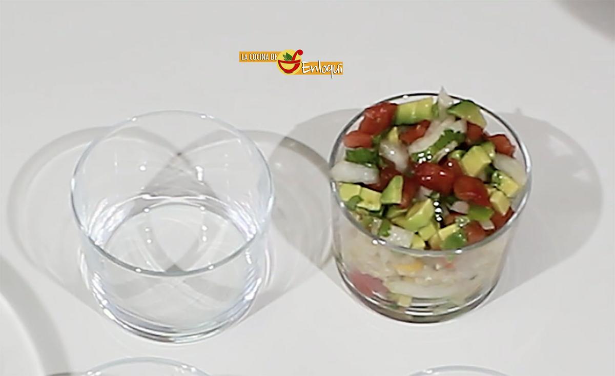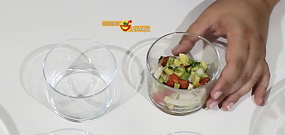 Para ello pon en el fondo de cada vaso una capa del guacamole que has preparado anteriormente.