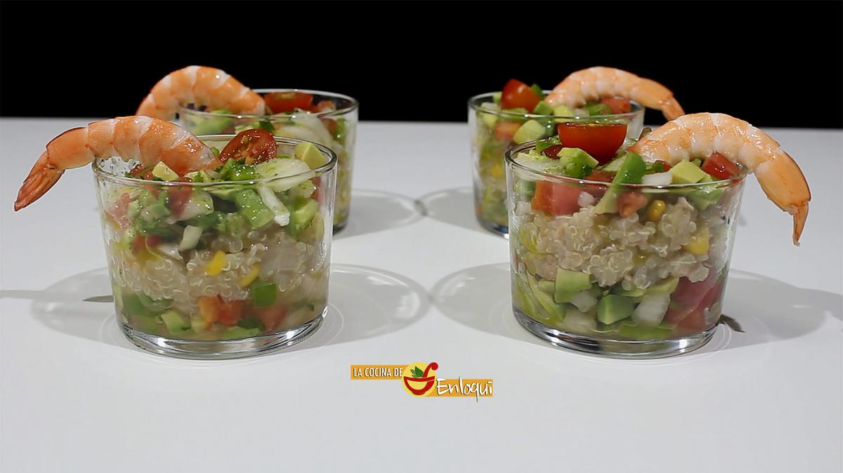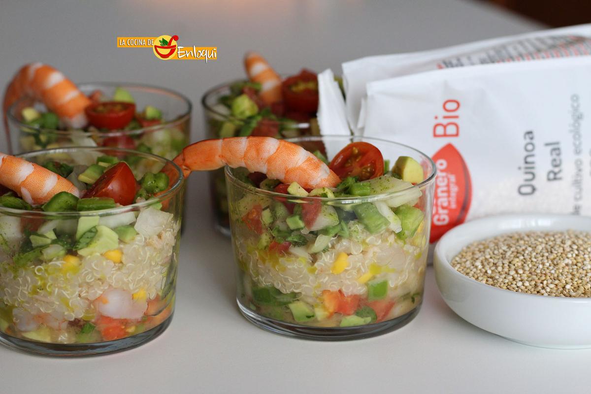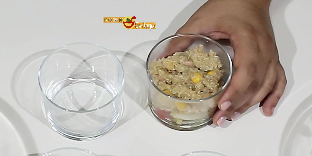 Vamos a presentar en la mesa nuestra ensalada de quinoa en raciones individuales, servidas en vasitos. Una forma original, diferente y práctica.