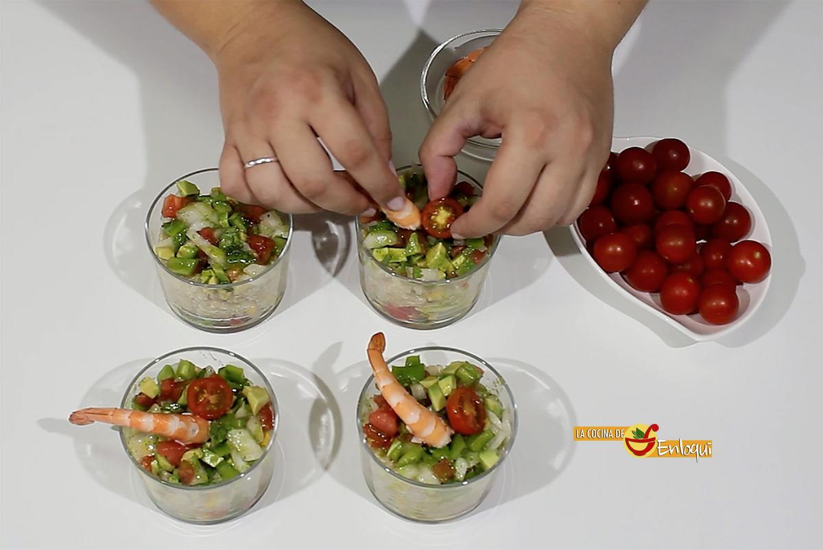 Decora con medio tomate cherry y un langostino pelado.