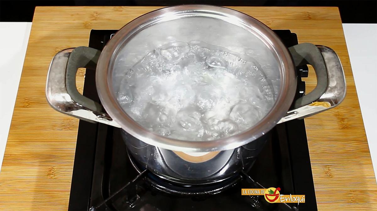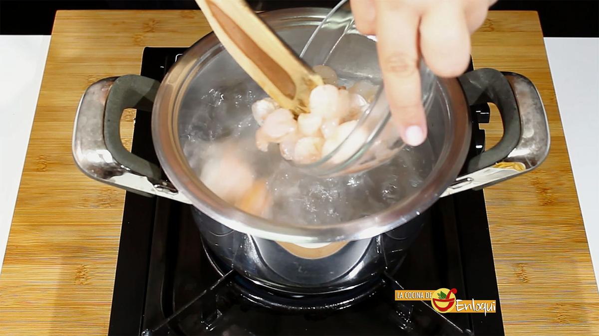 Pon una cazuela con agua al fuego, cuando rompa a hervir añade un poco de sal y cuece las gambas peladas. Estarán cocidas en pocos minutos, lo sabrás porque comenzarán a flotar en la superficie del agua.
