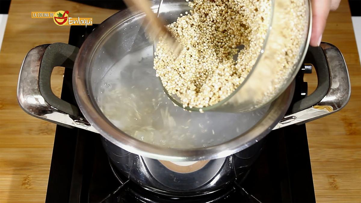 Cuando estén listas retira de la olla y en el mismo agua que has cocido las gambas pon a cocer la quinoa. De esta forma conseguiremos que la quinoa, que puede resultar un poco insípida, adquiera el sabor de las gambas. Sigue las recomendaciones de la marca que uses en cuanto a tiempos de cocción, en nuestro caso con 15 minutos será suficiente.