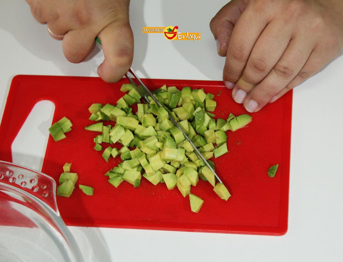 Vamos a complementar nuestra ensalada con un toque fresco de guacamole, para ello trocea en dados pequeños la cebolla, el pimiento, el tomate y el aguacate. Añade también unas ramitas de cilantro fresco bien picado.
