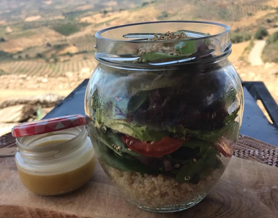 Pondremos a bajo la quinoa,después mezclum,tomate con unos granos de sal,encima el aguacate con unas gotas de limón y terminamos con más mezclum con volumen sin apretar y un poco de sésamo por encima,la vinagreta y lista.