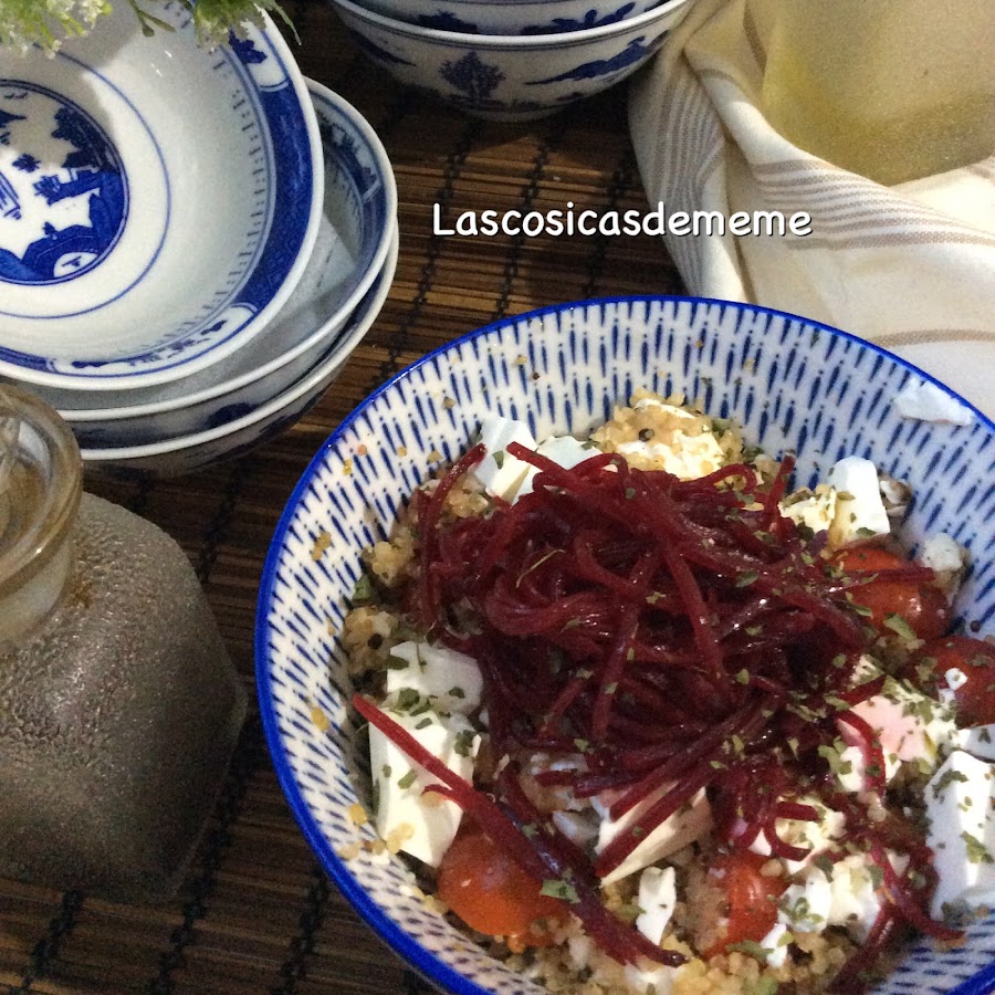 Solo tenemos que mezclar todos los ingredientes menos la remolacha que ponemos encima para que no se tinte el recto, aderezar...