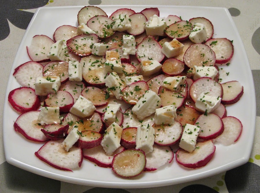 - Vierte la salsa por encima de los rabanitos y el queso.