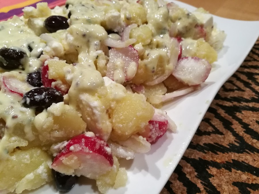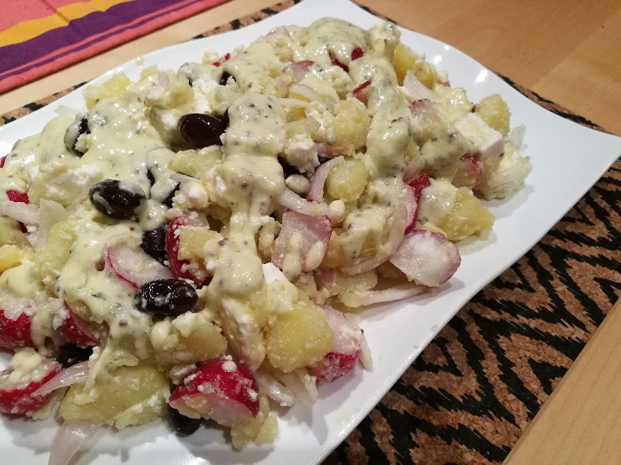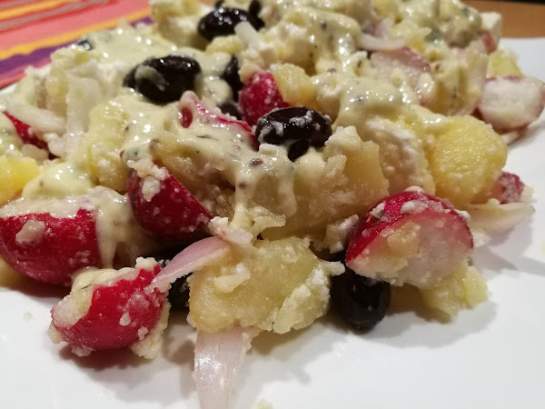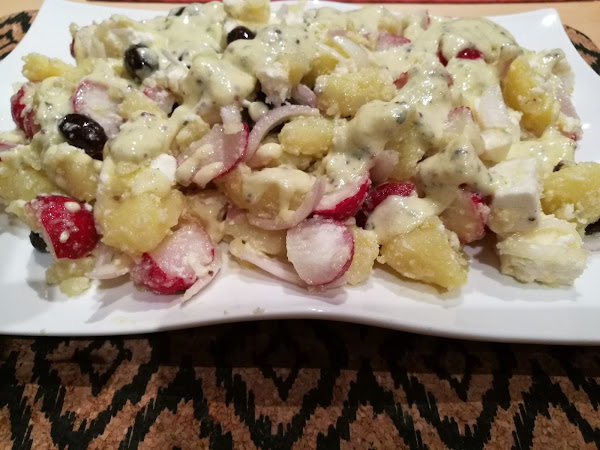 - Cuando estén las patatas, las pelamos y cortamos a trozos, las mezclamos con el queso y las aceitunas. Escurrimas la cebolla y los rábanos y los añadimos a la ensalada.