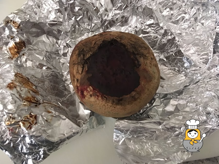 Lo primero que tenemos que preparar es la remolacha. Para esta ensalada, nosotros hemos optado por asarlas en el horno. Cortamos los tallos de las rmeolachas, las lavamos muy bien eliminando toda la tierra de la piel, las secamos y las envolvemos en papel de aluminio. Disponemos las remolachas en una bandeja de horno y las asamos durante una hora y media aproximadamente (comprobar siempre la cocción pinchando con un cuchillo) a 180ºC.