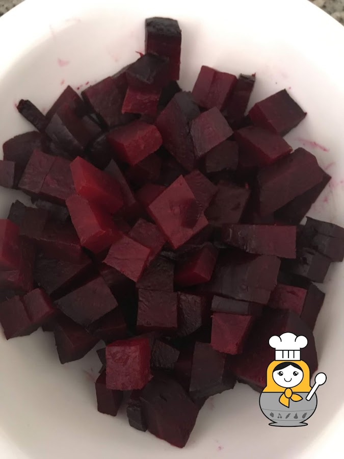 Una vez asadas, las sacamos del horno, retiramos el papel de aluminio con cuidado y esperamos a que enfríen un poco. Las pelamos tirando de la piel con un cuchillo, que se dsprenderá muy facilmente. Cortamos la remolacha en cubitos, más o menos del mismo tamaño y la colocamos en un bol.