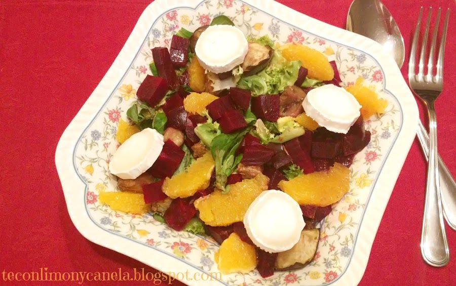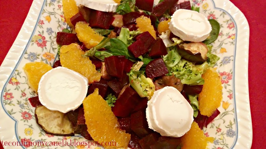 Una ENSALADA DE REMOLACHA, BERENJENA ASADA, NARANJA Y QUESO DE CABRA...