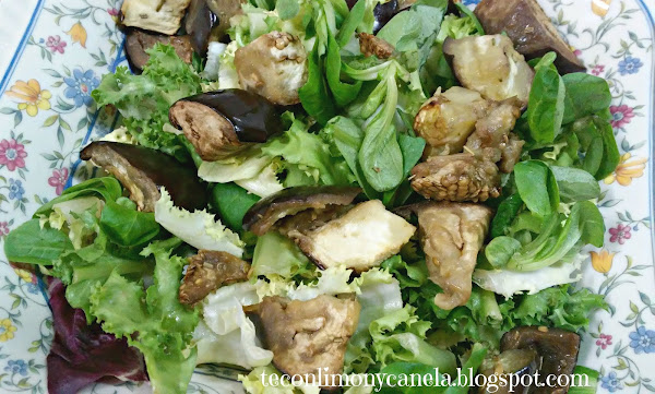 Sobre la ensalada aliñada incorporamos la berenjena...