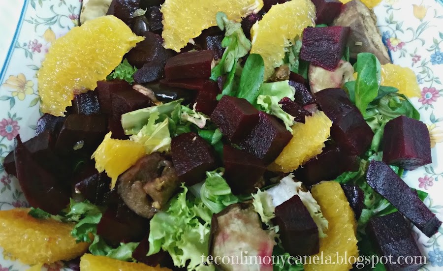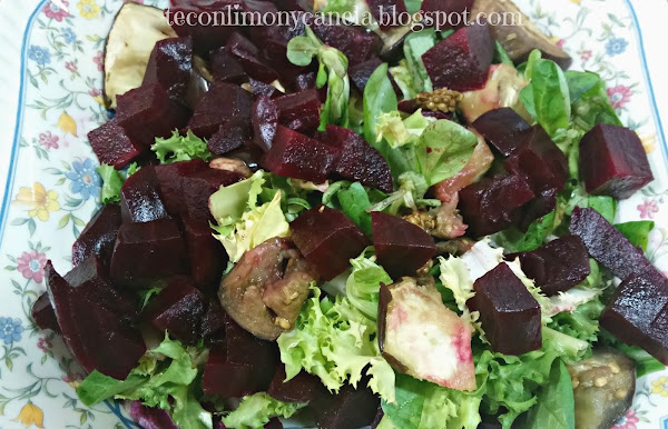 Y lleva remolacha asada, pero como no la encontré cruda y me había hecho a la idea de asar verdura, le incluí la berenjena, y le quité las avellanas, para hacerla algo más ligera...
