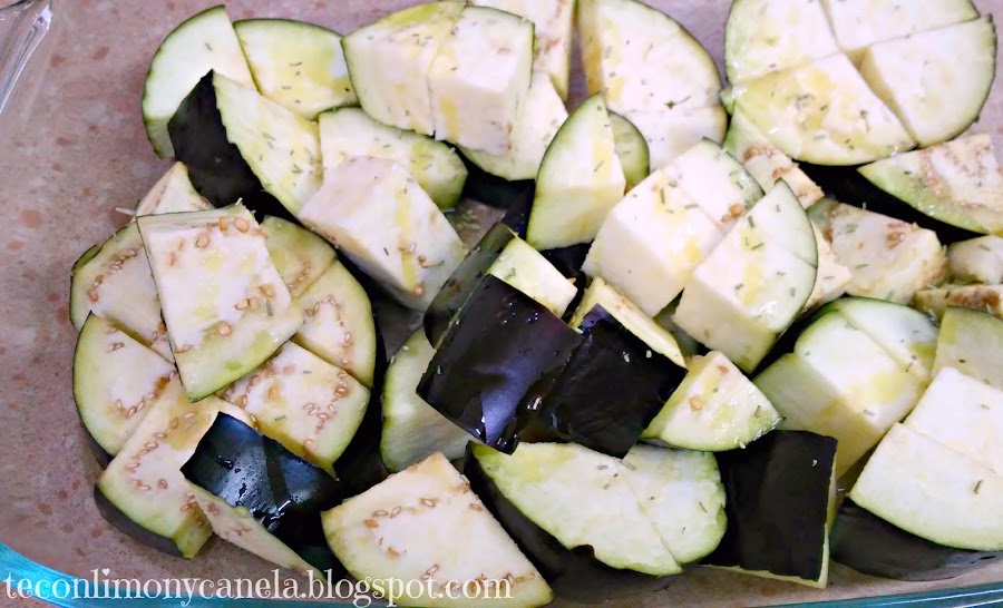 Lavamos y cortamos la berenjena en rodajas de unos dos centímetros, y a su vez en trozos.