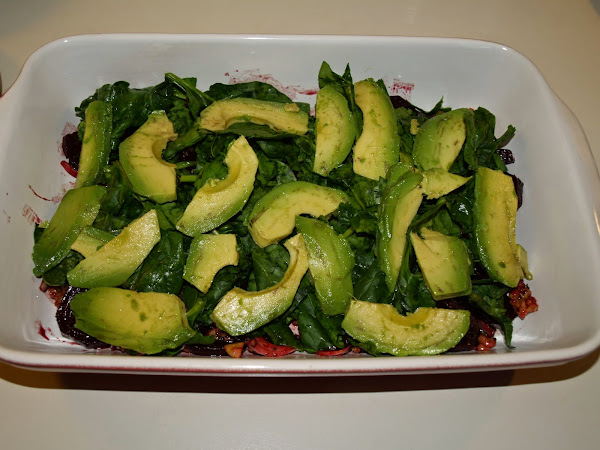 - Terminamos colocando el resto de remolacha, algunas hojas más de espinacas y el aguacate, y regamos con el resto del aliño.