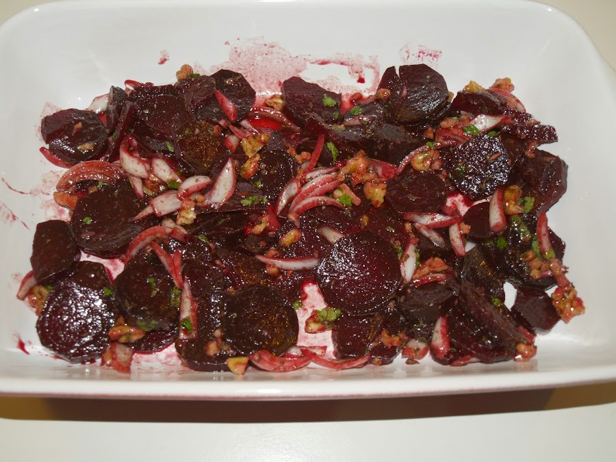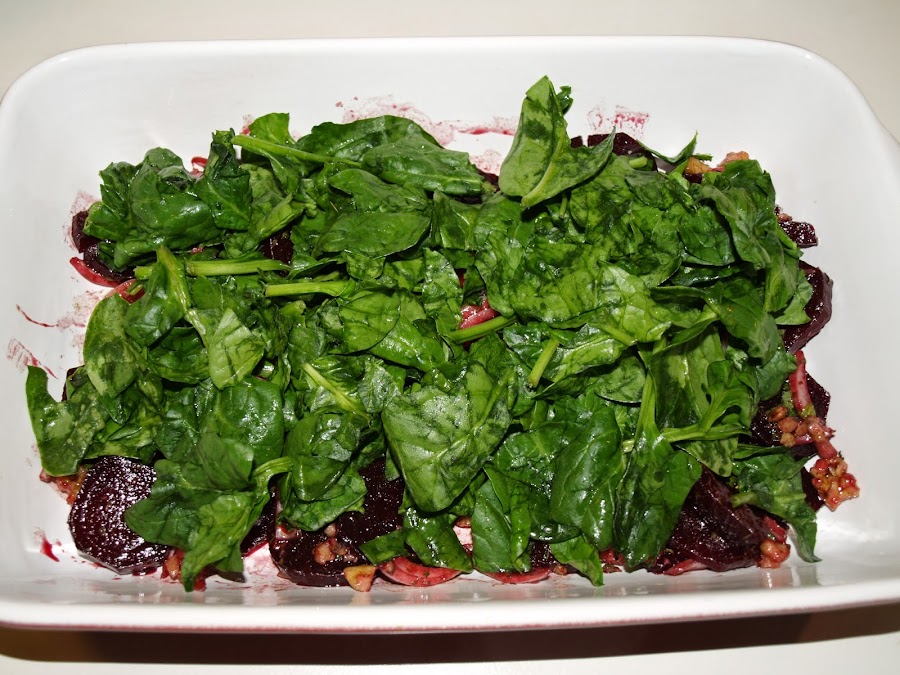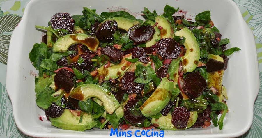 Cómo me gustan las ensaladas! Y esta qué rica estaba! Una ensalada templada, que viene muy bien cuando aún hace fresco, de remolacha asada (de la que soy muy fan), aguacate (qué maravilla de alimento!), espinacas y nueces (qué bien quedan los frutos secos en las ensaladas!). Con un aliño estupendo (inspirado en los que he aprendido del chef Ottolenghi, el tipo de ensalada en general) agridulce y un ligero regusto picante, os vais a chupar los dedos!