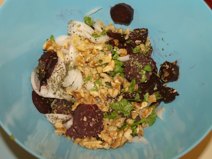 - Preparamos el aliño y echamos unos 2/3 al bol con la remolacha. Mezclamos bien.