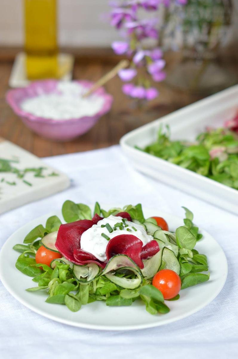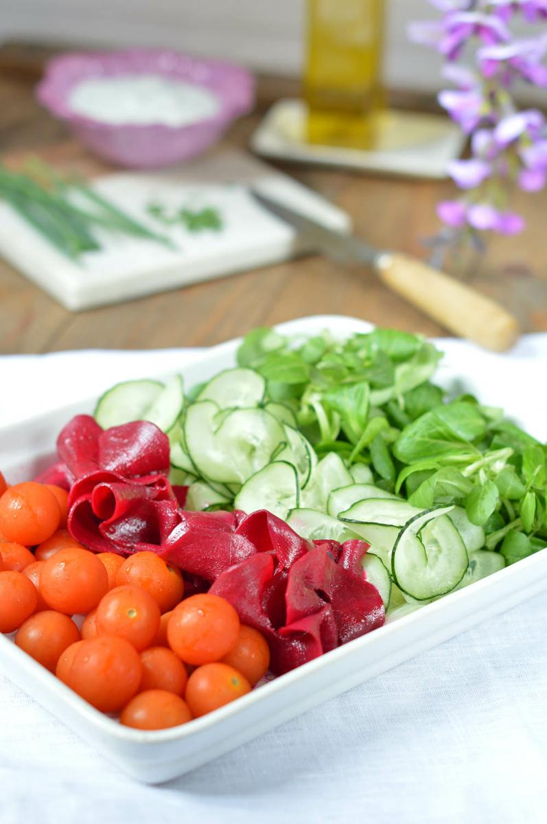 Hoy os traemos una ensalada muy simple pero refrescante acompañada de una salsa de queso fresco batido, para así salir un poco del clásico aliño aceite/vinagre. En esta ocasión hemos cortado la remolacha y el pepino en espirales para darle un toque de presentación diferente. Si tenéis un espirilizador de verduras fantástico, sino haceros con uno porque nos dará mucho juego este verano. Os dejamos un enlace donde podéis ver estos cortadores por si os interesan: Claudia & Julia.