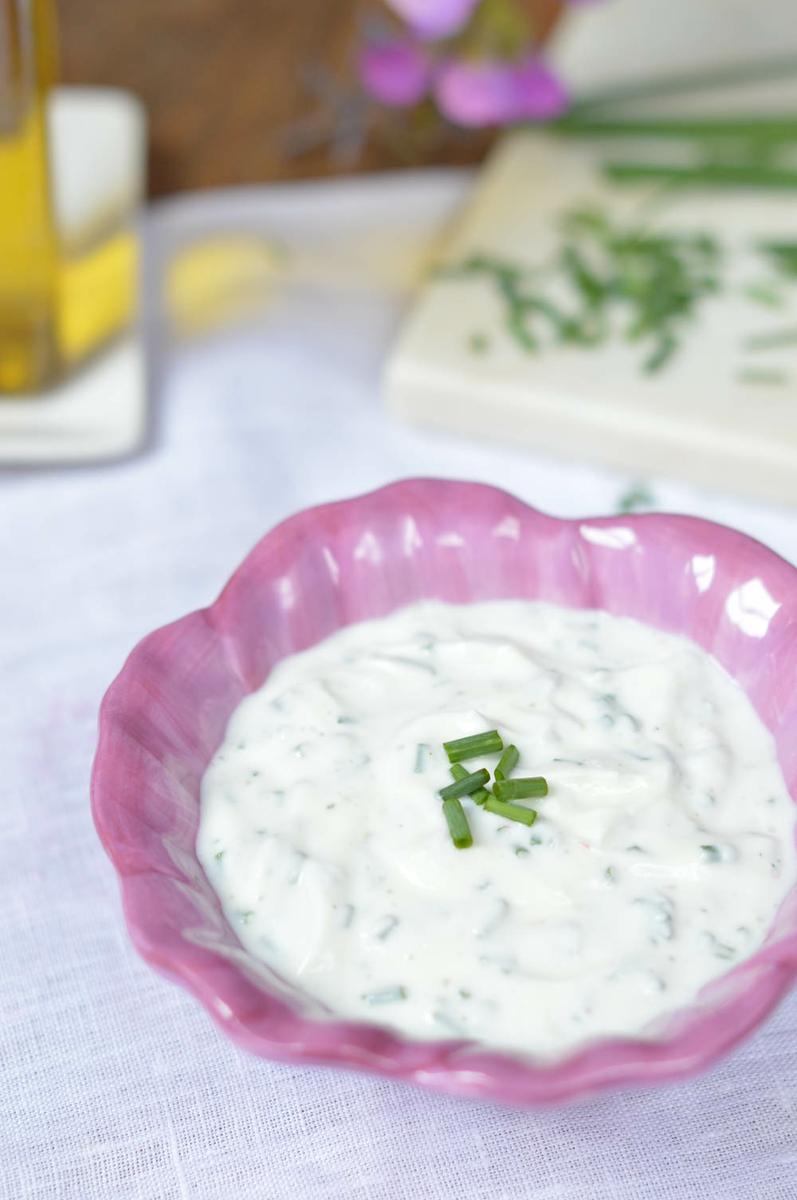 La salsa podemos hacerla con yogur griego sin azúcar. Queda bastante espesita, si la queremos más ligera podemos añadir un pelín de leche para aligerarla.