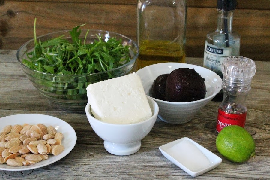 En un bol ponemos la rúcola previamente lavada (la de bolsa ya viene limpia), le ponemos el zumo de lima exprimido y removemos la rúcola, le añadimos sal, cortamos por encima la remolacha a trozos del tamaño que mas os guste, cortamos también el queso feta, ponemos las almendras tostadas por encima y aliñamos con aceite, vinagre balsámico y un poco de pimienta negra recién molida.