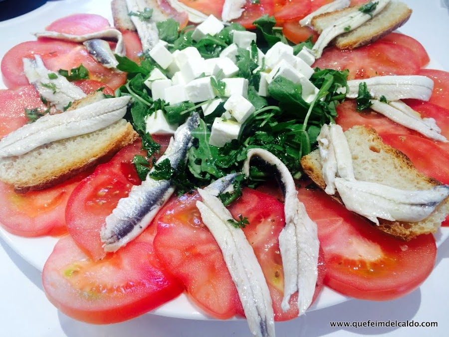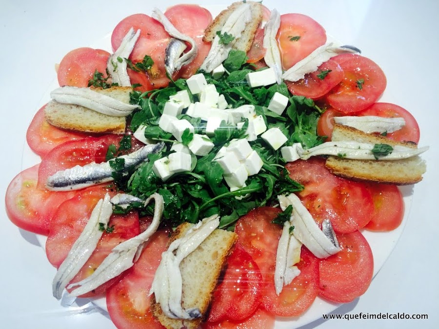 Para celebrarlo haremos una ensalada de tomate pagés con boquerones en vinagre, queso feta y rúcula, el aliño será de una vinagreta simple con perejil.