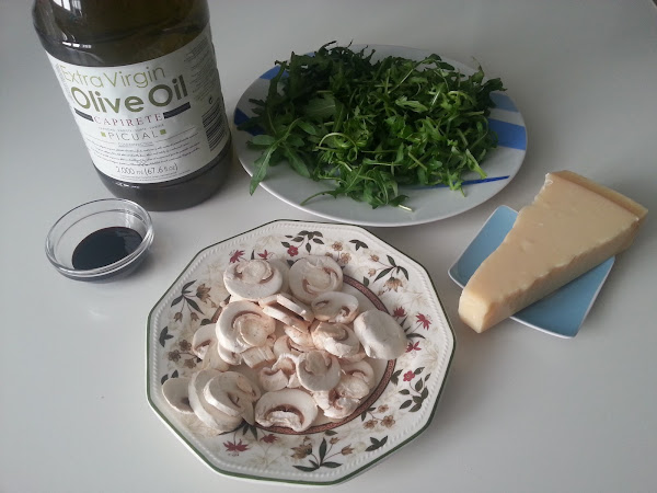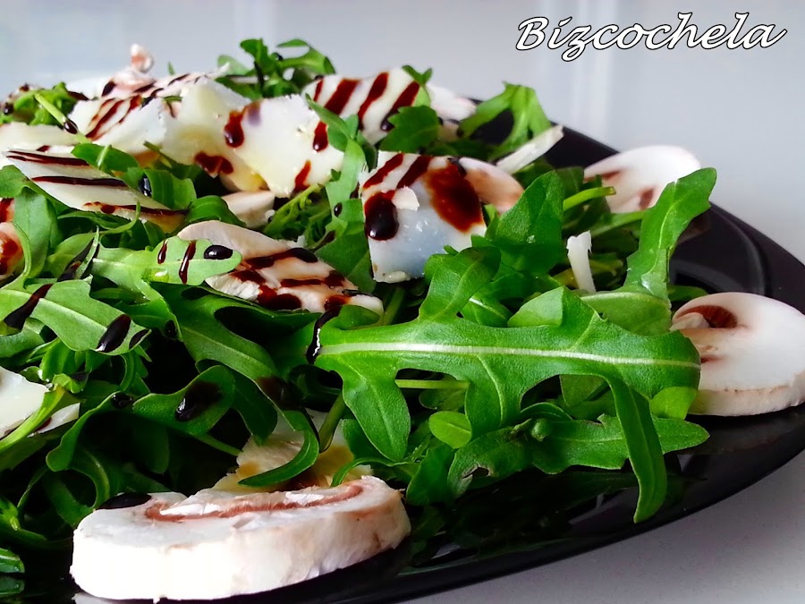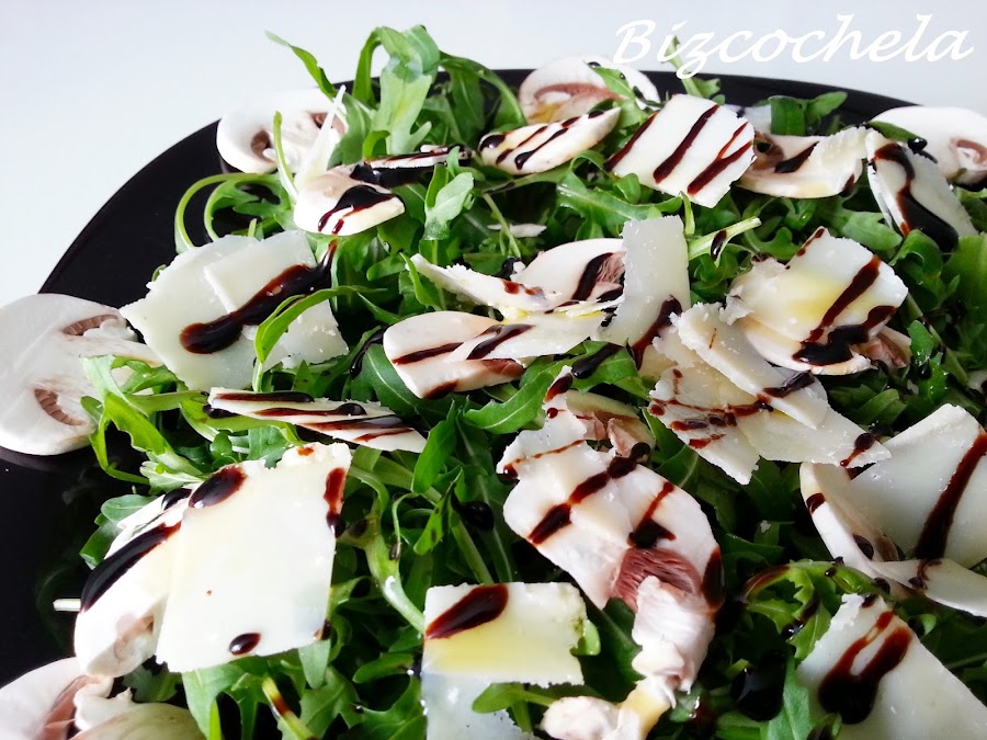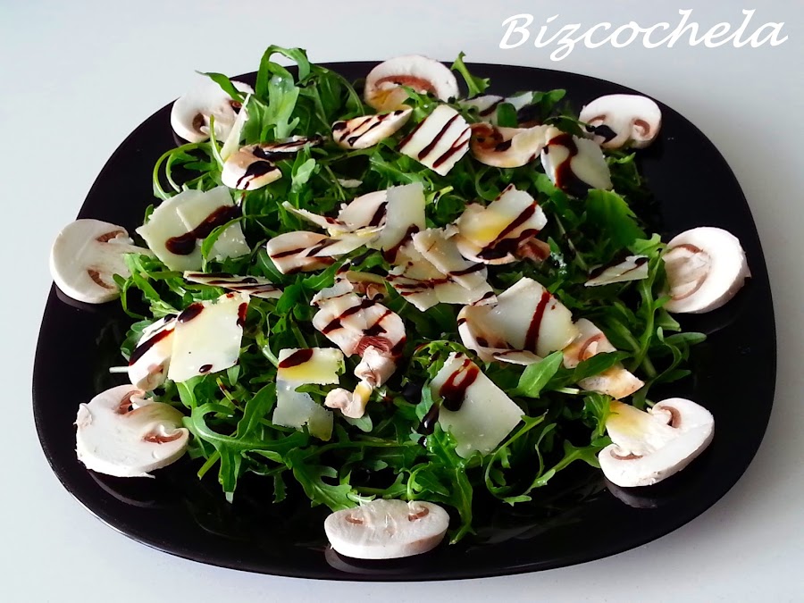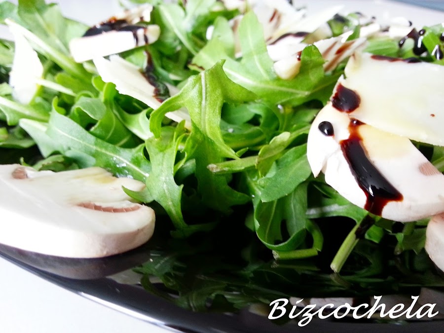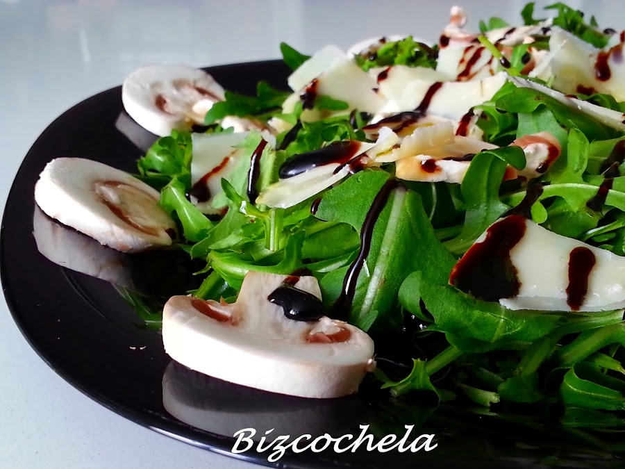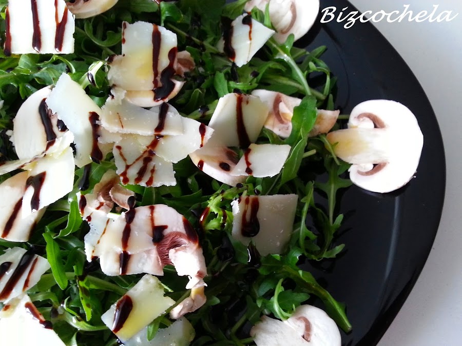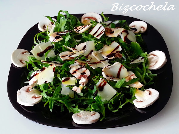 2. - Y sólo queda montar el plato con la rúcula, los champiñosnes y el queso, y aliñarlo al gusto.