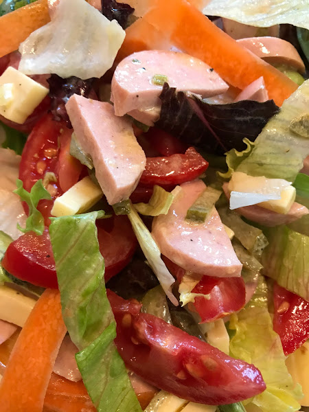 Vamos a dedicar un minuto a la elección de la materia prima: qué salchicha y dónde comprarla. Esta es un cuestión peliaguda porque donde yo vivo no hay problema con ello; en el primer supermercado ya la tienes. En Suiza es normal hacer la ensalada con la salchicha tipo Cervelas o bien con la típica Salatwurst, que es un producto procesado, un embutido "tipo mortadela", de los que te pones a cortar y no hay forma de parar.