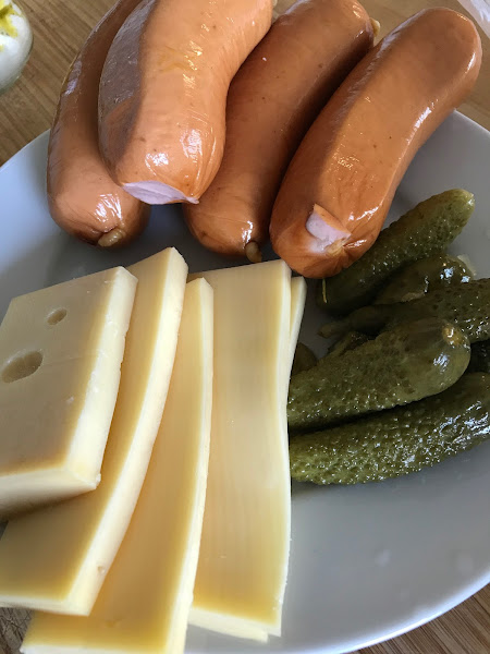 Cortar las salchichas en bastones, tiritas, o medias lunas. El queso en dado os tiras. Los pepinillos...