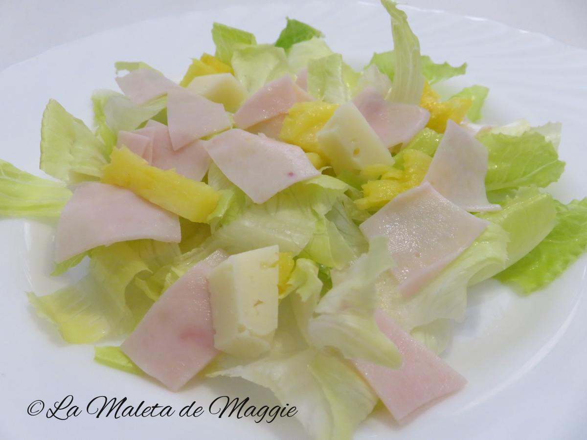 Repartiremos en platos la ensalada variada, el salmón ahumado, cortado en tiras finas y la piña cortada en trocitos pequeños.