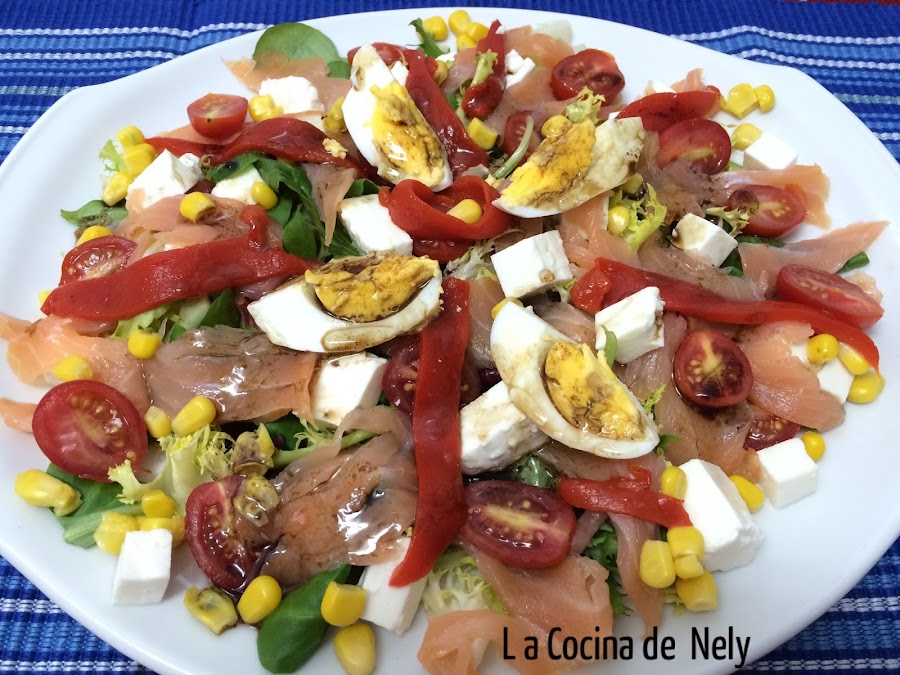 Luego vamos cortando pedacitos de salmón y repartirlos bien por el plato. añadimos maíz.