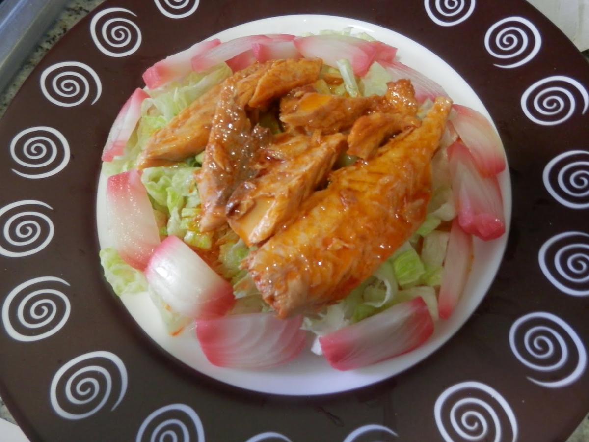 Cubrimos la ensalada con los filetes de salmón, procurando que quede todo bien cubierto.