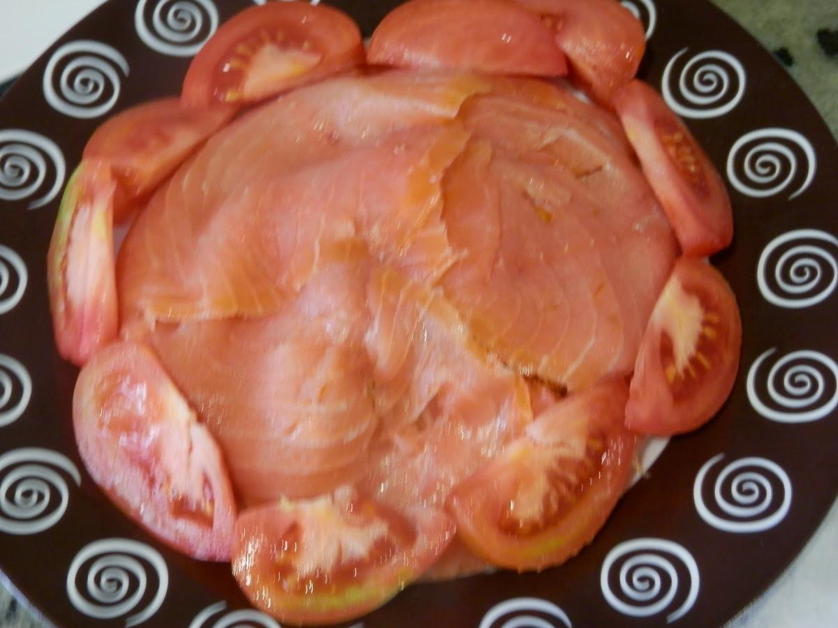 Ponemos en los bordes el tomate en gajos.