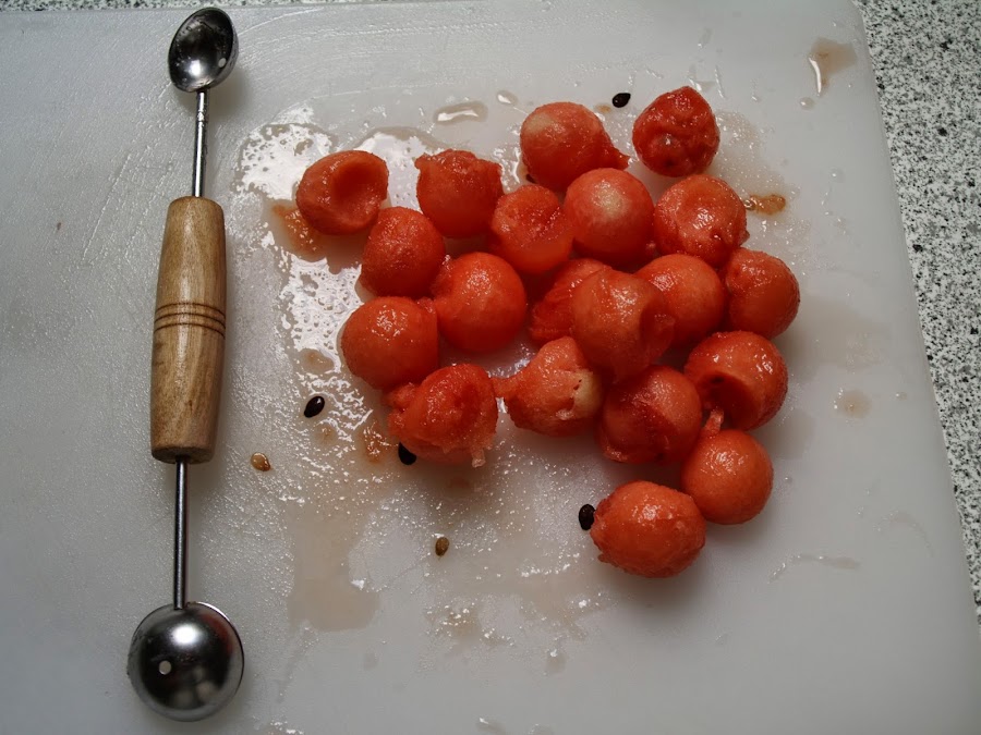 - Con un "saca-bolas" (o como se llame =D ) hacemos bolitas de sandía. Si no, cuadraditos. Reservamos.