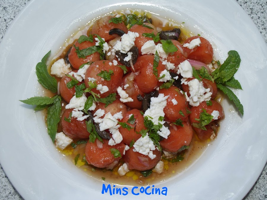 - Aliñamos, removemos, añadimos el queso feta desmigado por encima y por último menta fresca picada. La ensalada ya está lista para comer. Si preferís podéis meterla un rato en la nevera para que la sandía esté bien fresquita. En cualquier caso queda deliciosa y muy refrescante. Una joyita de ensalada!