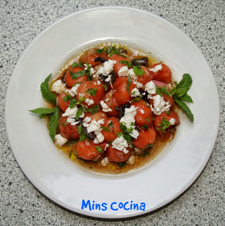 Vuelvo a incorporar la sandía en una ensalada con esta original receta de toques griegos. La mezcla de sabores queda fenomenal. Otra idea más para estos días de calor. Muy rápida y deliciosa. Os va a encantar seguro :) Para prepararla: