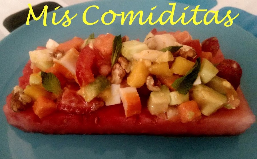 He usado la misma sandía como base de la ensalada, a modo de "plato", le he añadido un poco de proteína con el huevo y las bocas de mar y algo de carbohidrato con las nueces, así casi lo convierto en una cena completa si después nos tomamos un yogurt o un helado.