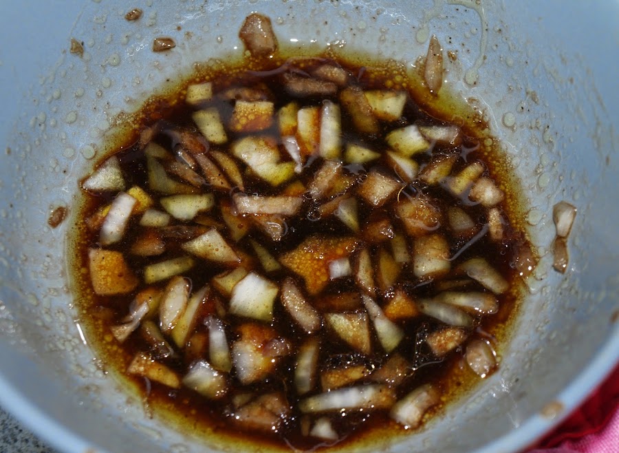 Para la vinagreta: cebolla, sal, pimienta negra en polvo, vinagre balsámico de Módena (el oscuro) y aceite de oliva