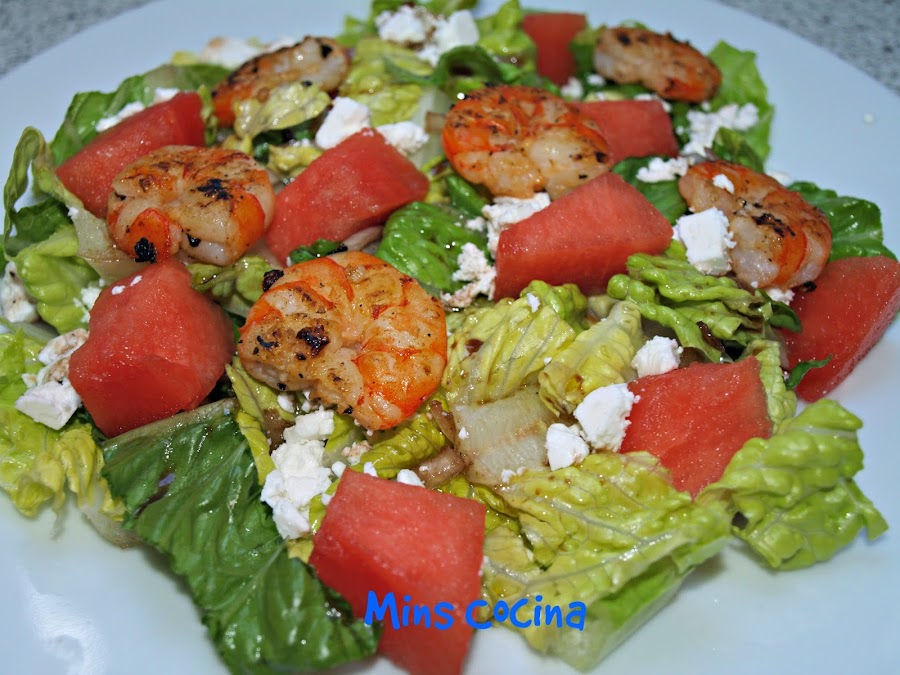 Lo se, lo se: qué título tan largo! Y encima esa combinación suena algo rara... cuanto menos original. Pero os prometo que os va a encantar! Yo era algo escéptica ya que, salvo en contadas excepciones, siempre he sido bastante tradicional en cuanto a ensaladas y, de hecho, pensar en no poner tomate en una era algo casi impensable para mí, por ejemplo. Pero después de ver numerosas recetas con fruta y de que varios conocidos me animaran, me decidí a probar y di con esta sorprendente y sabrosa ensalada que combina a la perfección el sabor característico del queso, el dulzor y frescor de la sandía, y las gambas maceradas en ajo a la parrilla. Todo ello sobre una capa de lechuga crujiente aliñada con vinagreta balsámica. Un festival de sabores en un solo bocado. La receta es bien sencilla: (las cantidades, según el número de comensales. Vosotros decidís)