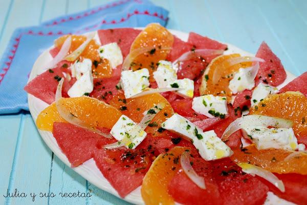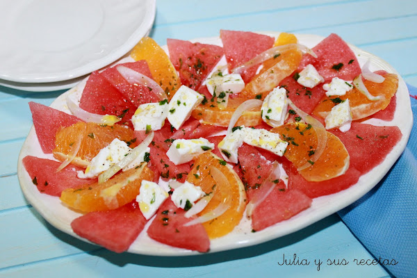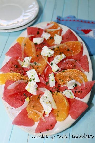 Aquí os traigo un día más otra de mis ricas ensaladas. Tomad nota de ella, es muy fresca, fácil y rápida de hacer. Ahora que las sandías están en plena temporada y antes de que se pase, hay que aprovecharlas y hacer ricos platos con ella.