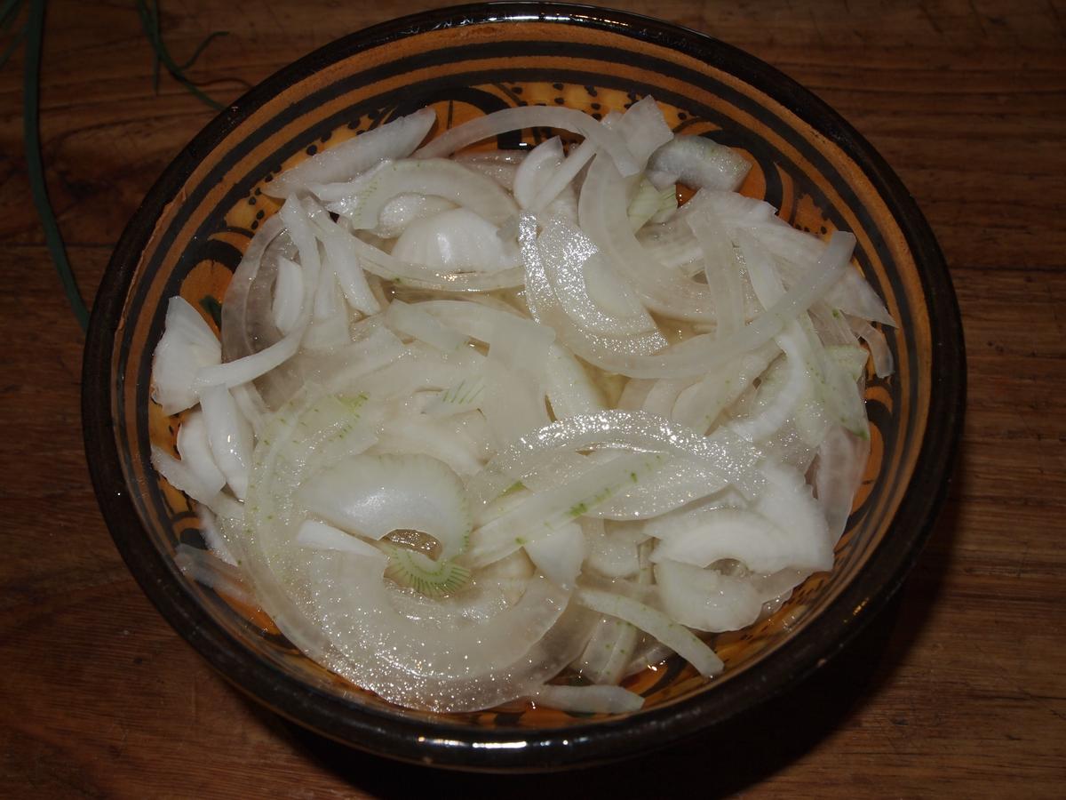 Lo primero es poner a macerar la cebolla para que no sepa tan fuerte. Yo suelo tener siempre un bote de cebolla con vinagre en la nevera, la dulcifica y es ideal para cualquier ensalada. Si podéis, os recomiendo ponerla a macerar la noche antes, sino, dejadla por lo menos media hora en remojo.