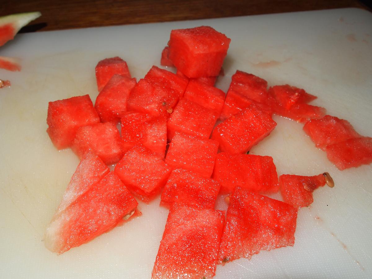Quitamos los pipos a la sandía y cortamos en cuadrados, vertemos en un bol o cuenco donde vayamos a servir la ensalada.