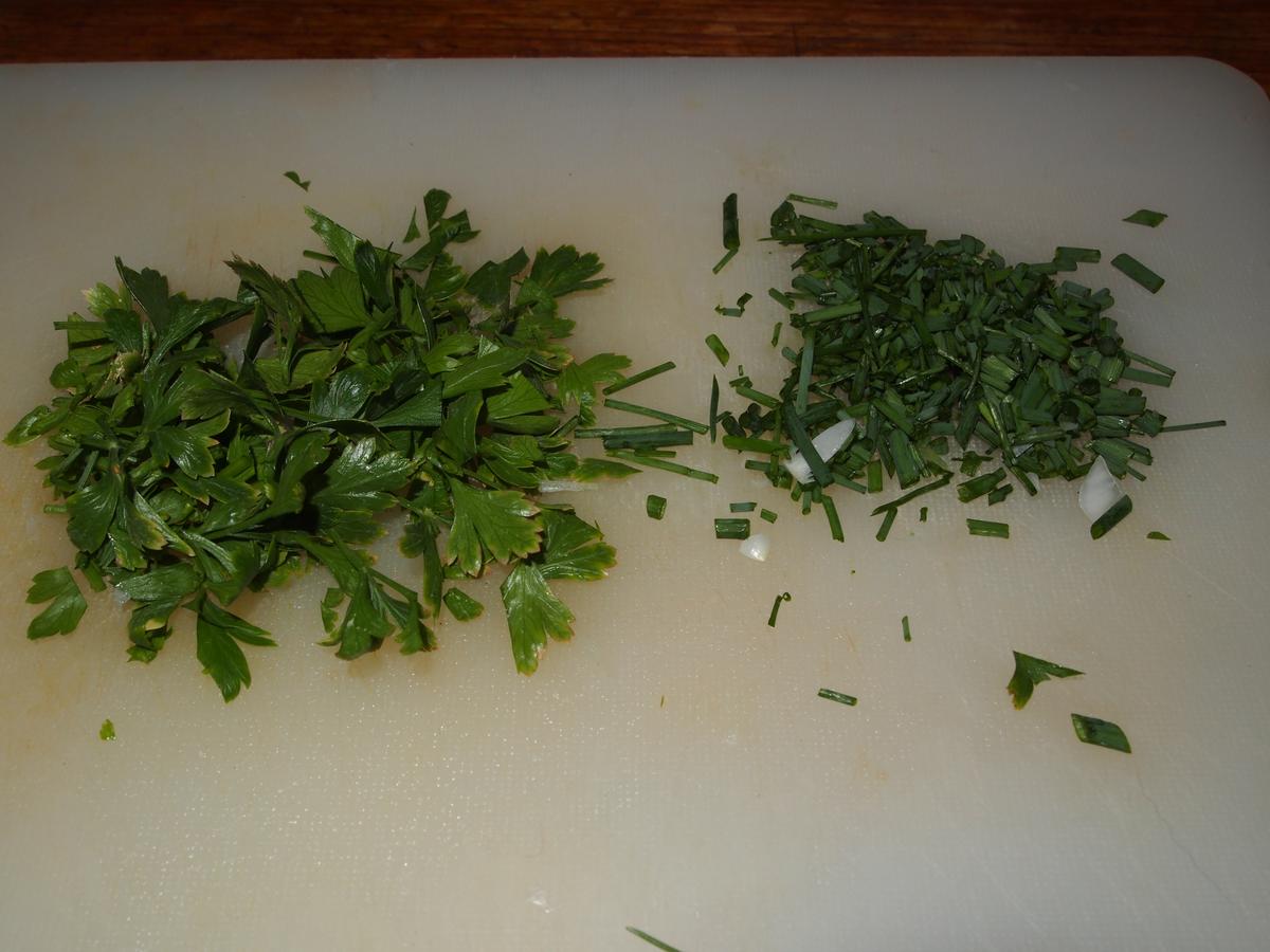 Picamos ligeramente el perejil y el cebollino y lo agregamos al bol.