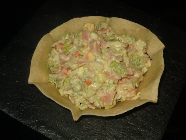 Mientras vamos elaborando nuestra ensalada, picamos la lechuga, el surimi, el jamón york y el huevo cocido, echamos buena cantidad de mayonesa. Colocamos el relleno dentro de la tortilla y servimos. Una forma original de presentar las ensaladas.