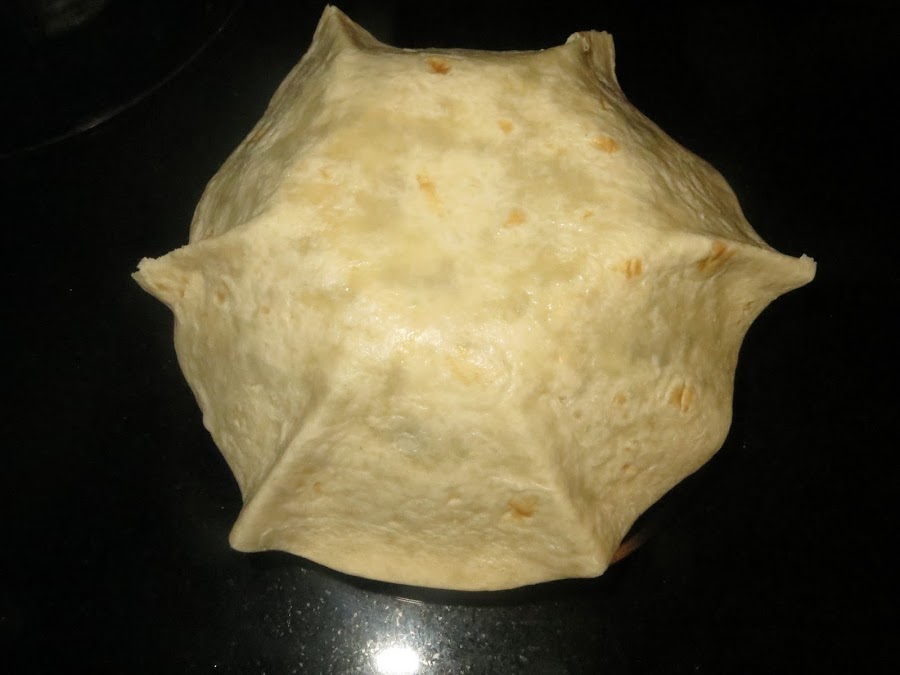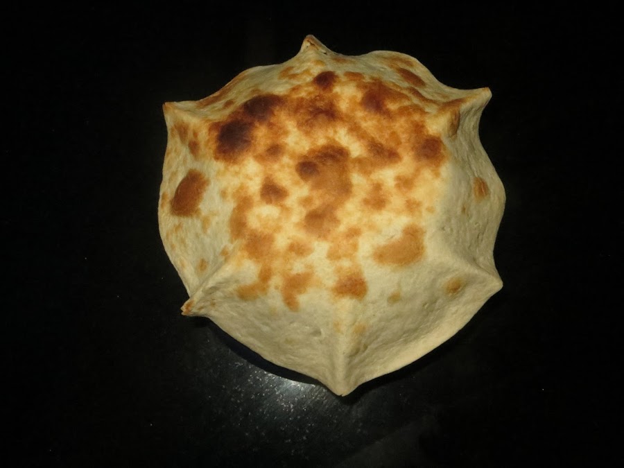 Precalentamos el horno a 180º y ponemos la rejilla a media altura, ahora cogemos un cuenco lo ponemos boca abajo y lo engrasamos con un poco de aceite. Humedecemos un poco la tortilla por ambos lado, sobre todo los bordes, para que se vuelva más flexible. Colocamos la tortilla encima y presionamos para darle forma. Doblamos un poco los bordes para ir haciendo una especie de pliegues y lo metemos al horno durante cinco minutos, tened cuidado que se quema enseguida. Sacamos y la ponemos sobre una rejilla hasta que se enfríe.