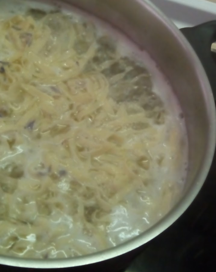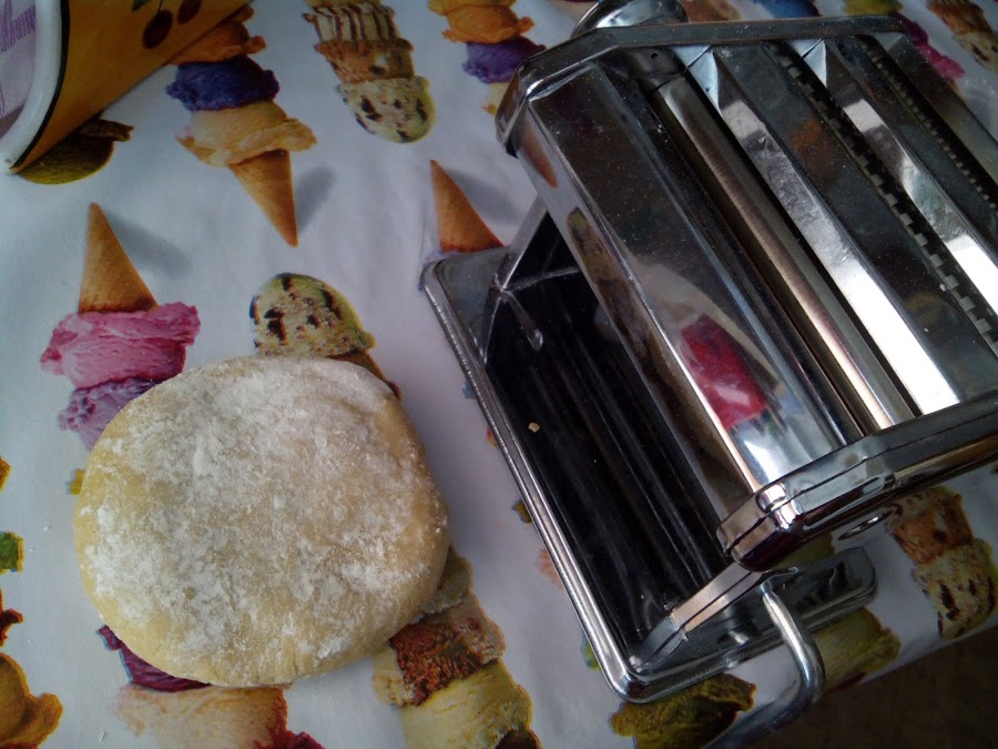 Laminar la pasta con maquina o manualmente con un rodillo y después cortar tiras finas y estrechas.