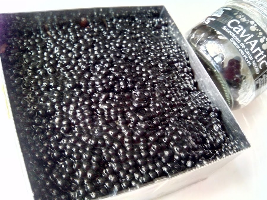 250g de gambas blancas, un botecito de huevas negra de lumpo y sal negra en pirámides (2-9mm) (India) para decorar.