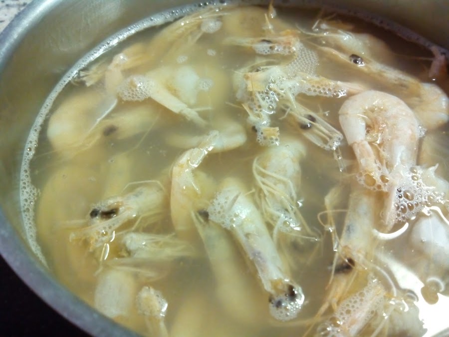 Poner en un cazo de tamaño adecuado a calentar agua con sal, cuando esté hirviendo se echan las gambas y se apartan del fuego. –El calor residual es suficiente para que se hagan y no se pasen- Pelar las gambas una vez frías y reservar.
