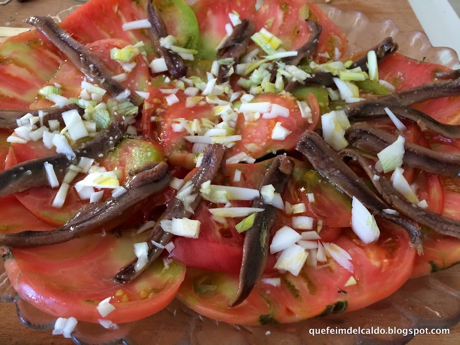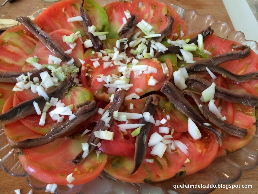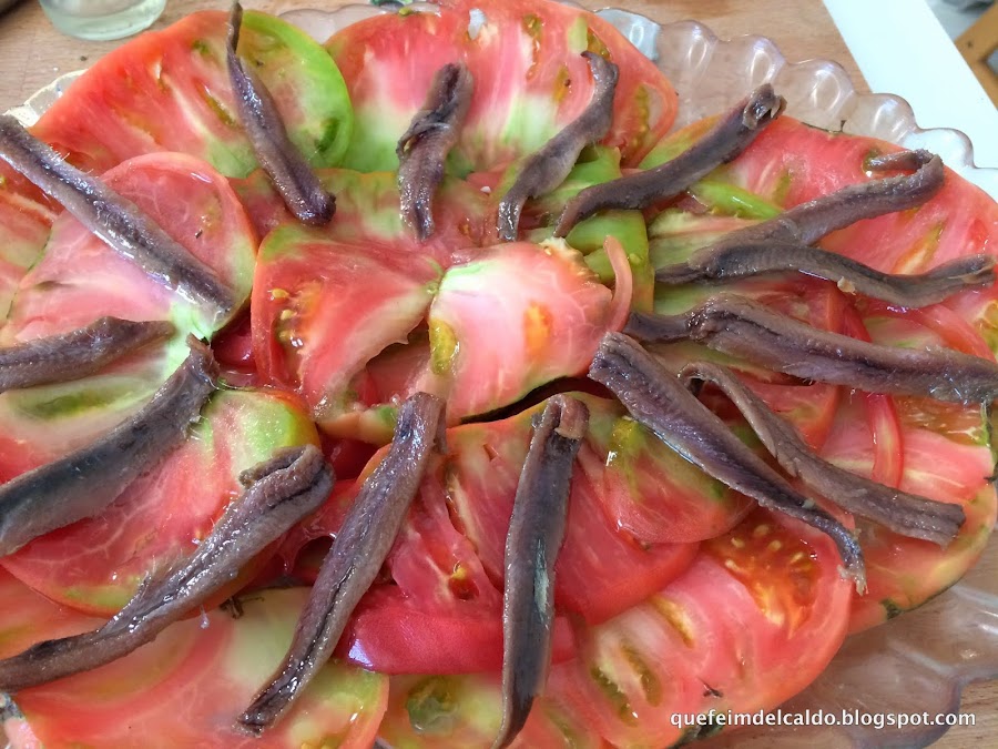 Sobre los tomates colocamos los filetes de anchoa de Santoña que también son de buena calidad.