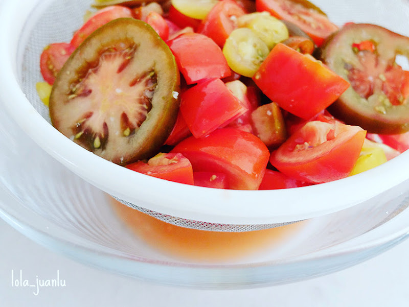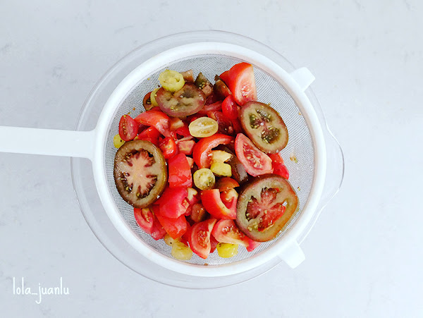 Colocamos un colador grande en un bol e introducimos los tomates en el colador, los sazonamos con sal gorda y revolvemos. Esto hará que los tomates liberen el agua concentrando el sabor en las piezas. Dejamos reposar y transcurridos 15 minutos, veremos el jugo que han soltado los tomates.