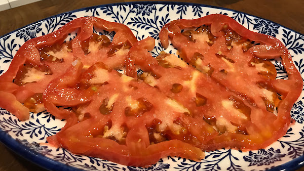 Coloca las rodajas de tomate en una fuente.
